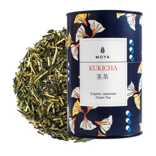 Moya Kukicha Ekologiskt Japanskt Grönt Te Lösa Blad | 100g |Te från Japan | Vänligt för Veganer och Vegetarianer | Förpackat i en Flerfärgad Kartongburk | Perfekt för en Present
