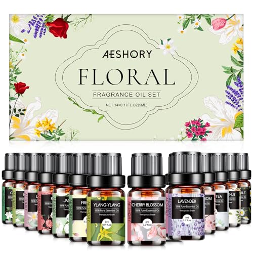 AESHORY Blommiga Eteriska Oljor Set 14 x 5ML, Aroma Diffuser Olja Gift Set, 100% Naturlig Aromaterapi Doftoljor för Diffusorer, Luftfuktare, SPA, Massage - Ros, Jasmin, Lavendel, Kamomill, Vitt Te