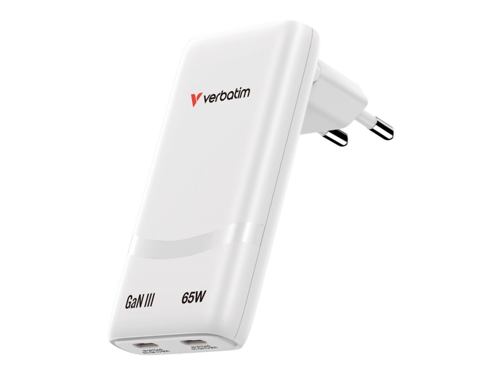 Verbatim Fold 'N' Go - Strömadapter - Gan - 65 Watt - 3.25 A - Power Delivery 3.0 + Pps - 2 Utdatakontakter (Usb-C) - Vit - Europa