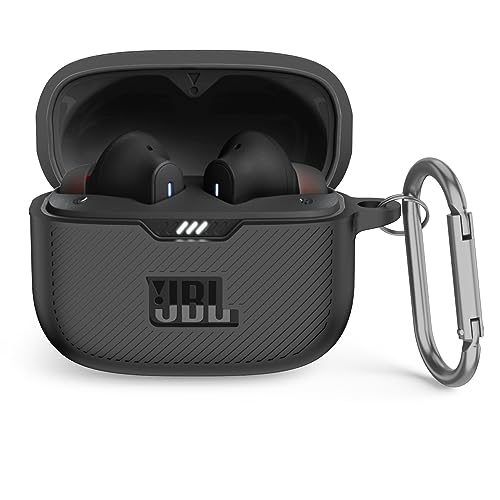 MOWYEOK Silikonfodral kompatibelt med JBL Tune 230NC TWS, bärbart rep- och stötsäkert silikonfodral, främre LED, synlig, för JBL Tune 230NC hustillbehör, med karbinhakar – svart