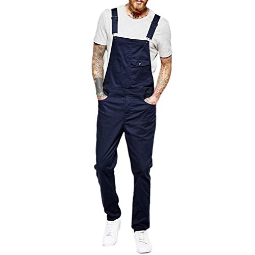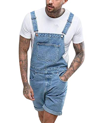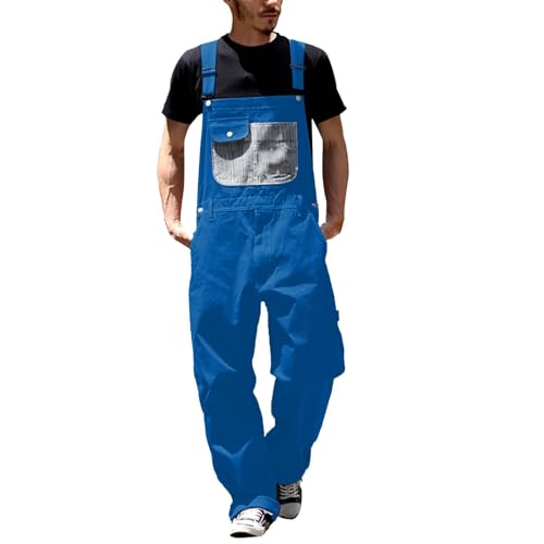 Runcati Herr hängselbyxor bomull jeans overall korta arbetsbyxor lös passform män denim jumpsuit med fickor, blå, L