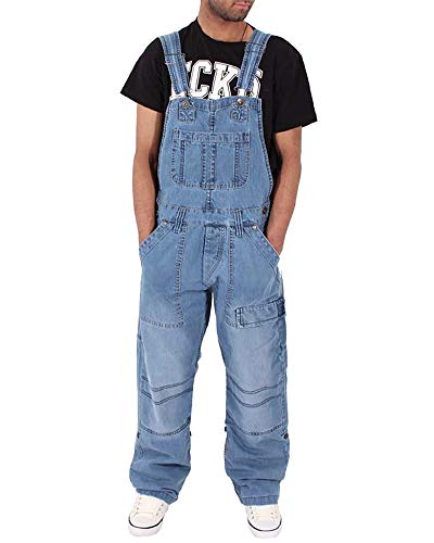 Enzo Jeans herr, blå denim, hängselbyxor, stentvättade hängselbyxor, overaller, midja 76 cm - 127 cm, Blek tvätt, 42W x 32L