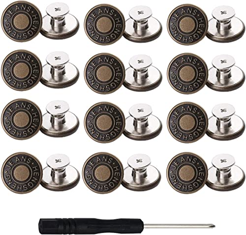 XiangJunly 50 st knappstift för jeans, 17 mm jeansknappar metallersättning, inga sömmade jeansknappar, justerbara avtagbara snabbklämmor snäppstift knappar för jeansbyxor, med skruvmejsel, 10 stilar
