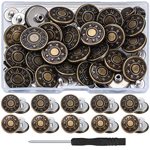 30 stycken ersättningsknappar, 17 mm jeansknappar, byxknappar, ingen sömnad, avtagbara metallbyxor, knappar, reparation tryckknappar, knappar för jeans, kläder, byxor, väskor, 2 mönster (brun)
