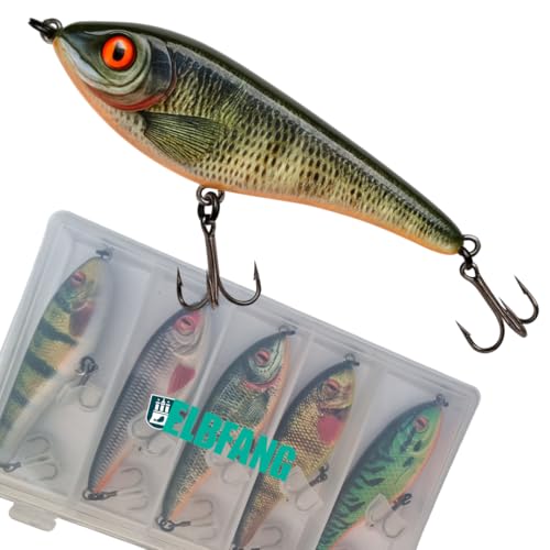 ELBFANG Jerkbait set – jerkbait gädda – Jerk Wobbler – inklusive plastbetesbox (5 stycken/låda/90 mm/21 g)