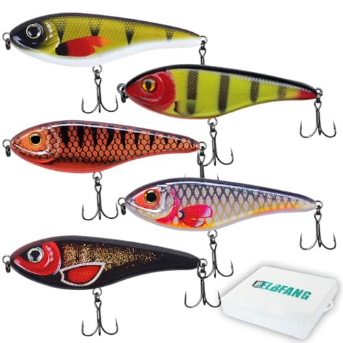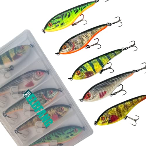 ELBFANG Jerkbait set – jerkbait gädda – Jerk wobbler – gädda bete (5 stycken/låda/90 mm/21 g)