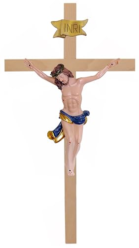 Kall present – träkors, väggkors, krucifix av äkta trä med Jesus Kristus, figur av konstgjord sten, handmålad/kors, ekfärgad färgad färgad (höjd 35 cm)
