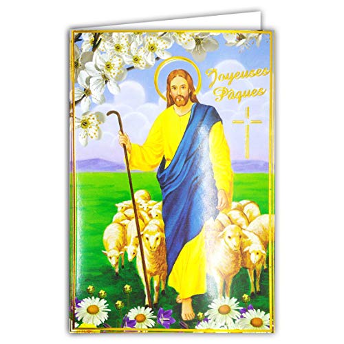 Afie 62-1010-B glad guldfärgad PÅSK kort och vitt kuvert - Katolsk religion kors Jesus Kristus god herdeshepherd lamm får flock blommor fest