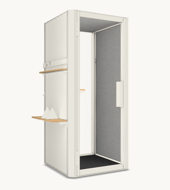 MUTE Telefonbås Jetson S1, H225 x B100 D100 cm Tillbehör: Sittpall & Library set (Deep shelf. shallow display rail. wall hook. stand. 2 magnets. bookends) Moon white (NCS S 1000-N)