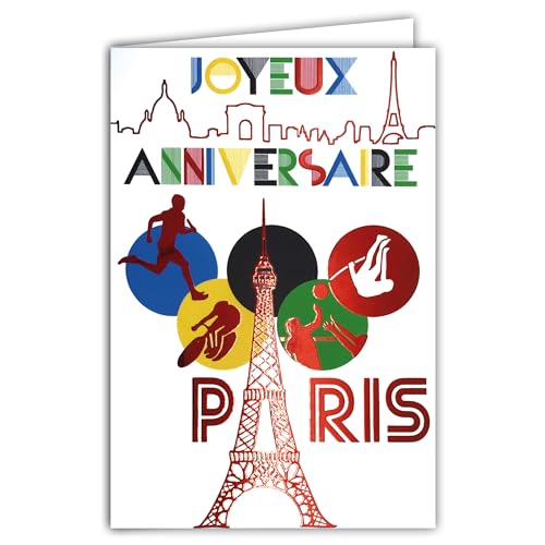 65-1421 Happy Birthday Paris Eiffeltornet kort i glänsande rött med kuvert 12 x 17,5 cm löpning relä pol jump cykel volleyboll JO skapelse utgåva tryck fransk tillverkning