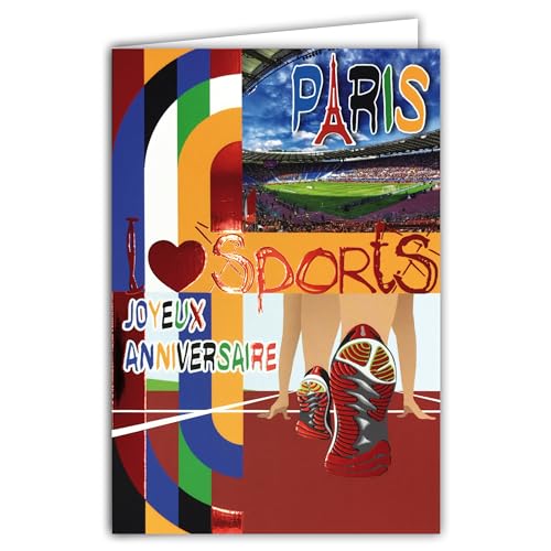 65-1420 Grattis på födelsedagen "I love sport" rött glänsande kort med kuvert 12 x 17,5 cm friidrott löpning korg Stade JO OS Paris skapelse utgåva tryck fransk tillverkning