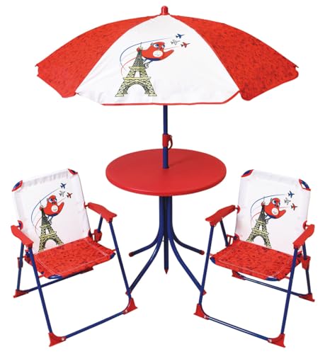 FUN HOUSE 713592 olympiska spelen Paris 2024 Garden Salon JO för barn med ett bord H 46 x Ø 46 cm, två stolar H 53 X L.38,5 x D.37,5 cm och ett parasoll H.125 X Ø 100 cm, vit röd