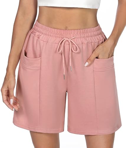Demegimi Sportshorts dam korta byxor med fickor gym dam bomull shorts shorts dam sommar hög midja shorts för jogging sport yoga och fitness, Rosenröd, L