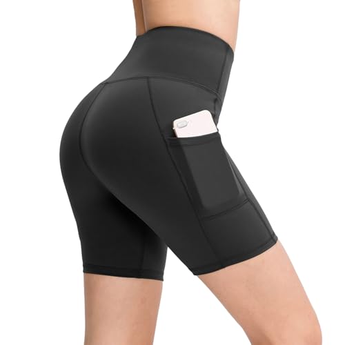 COTOP Korta leggings, dam, sporttights, kort sommar, yogabyxor, hög midja, löparbyxor med ficka, shorts för gym, träning, fitness, jogging, löpning, biker, svart, M