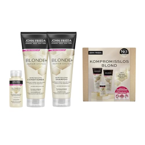 John Frieda Blonde Repair System Förmånsset – Innehåll: Förschampo Behandling, 100 ml, schampo, 250 ml, balsam, 250 ml – Inkluderar gratis MegRhythm ögonmask – Med Bond Building Plex