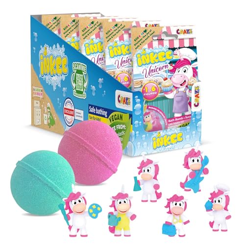 INKEE Surprise UNICORN PROFESSIONS | Enhörningsbadbomb för barn med överraskning – 1 av 6 olika enhörningar att samla – badkula 100 g med bananmjölkshake-arom och jojobaolja, rosa eller grön