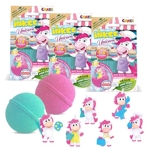 INKEE Surprise UNICORN PROFESSIONS | 3 x badbomber för barn med överraskning – 3 av 6 olika enhörningar att samla – 3 x 100 g badbollar med bananmjölkshakearom och jojobaolja, rosa eller grön