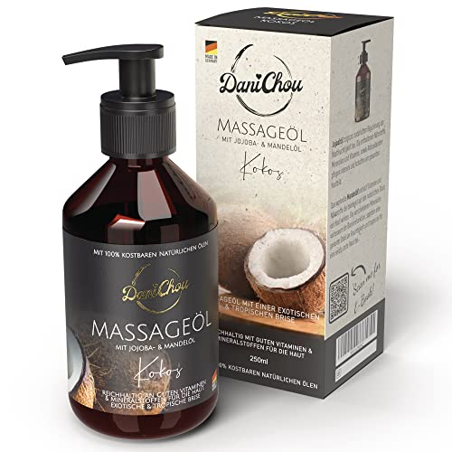 DaniChou® massageolja kokosnöt, 250ml med jojobaolja & mandelolja, 100% naturlig kosmetika & eteriska oljor, massageolja avslappning med en exotisk & tropisk bris | Utan paraffiner och färgämnen