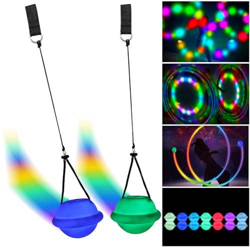 2 stycken LED-Poi-bollar i set – lysande jongleringsbollar med regnbågsfärger och strobeeffekt, justerbara dubbla slingor, Glow Pois för barn och vuxna, nybörjare och proffs, Lightpainting tillbehör