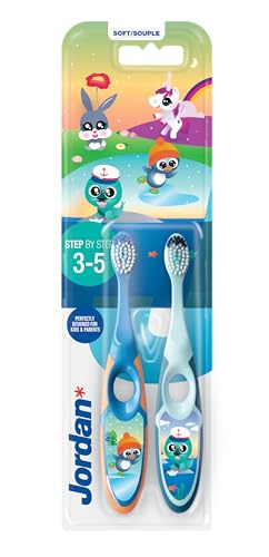 Jordan® Step 2 barntandborste i 3-5 år, mjuk borst, dubbelt ergonomiskt handtag och BPA-fri, blå färg, paket med 2 enheter