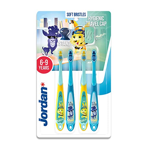 Jordan ® | Step 3 tandborste för barn | Tandborste för barn från 6 till 9 år | mjuk borste, ergonomiskt dubbelt handtag och BPA-fri | blå och gul | 4-pack