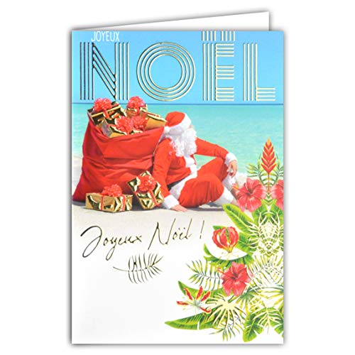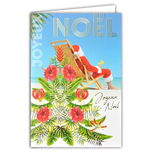 Karta God jul jultomte röd mössa cocktail solstol strand hav blå turkos garvträd blommor exotisk tropisk Dom-Tom guld glänsande