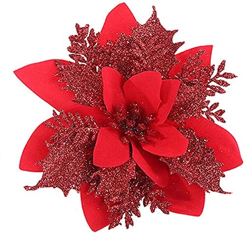 SWECOMZE 12 stycken glitter, julgransprydnader, jul, blommor, prydnad, juldekor, julgranshängare, 14 cm (röd)