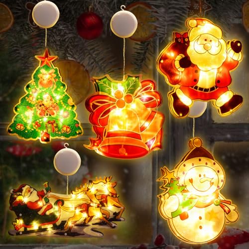 4 stycken LED-fönsterdekoration, jul, julbelysning, fönster, juldekoration inomhus med sugkoppar, snöflingor, julgran, klocka och renmotiv, varmt vitt ljus, batteridriven