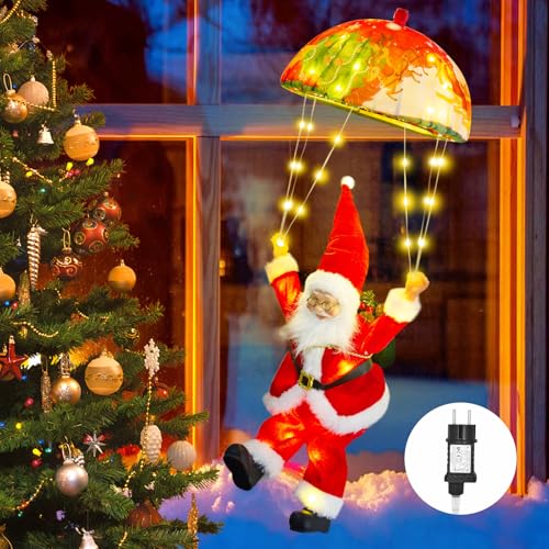 Jultomte, fallskärm, ljusslinga, 63 cm, 70 LED, julljusslinga, kontakt med timer, 8 lägen, julbelysning för inomhus, utomhus, juldekoration, fönster, julgran, balkong (varmvit)