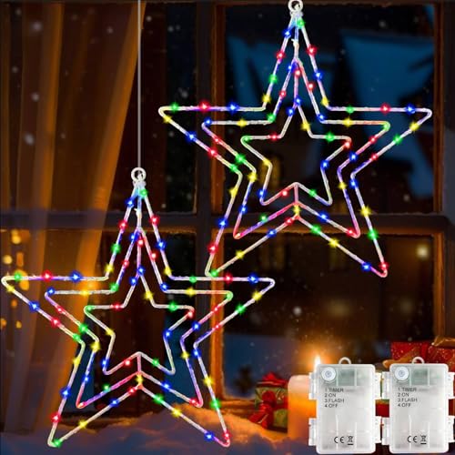 Redefun Julbelysning för fönster, 2 stycken 75 LED-julstjärna, ljuskedjor, batteridriven, 8 lägen, hängande julbelysning med timer för inomhus, utomhus, juldekoration (flerfärgad)