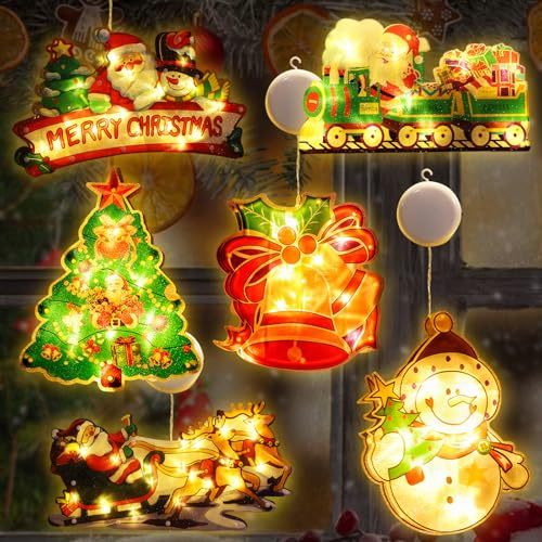 Fönsterdekorationer för jul, 5 st., LED-juldekoration, batteridrivna, med sugkoppar, juldekoration för inomhus, utomhus och balkong, julbelysning för fönster, till fester