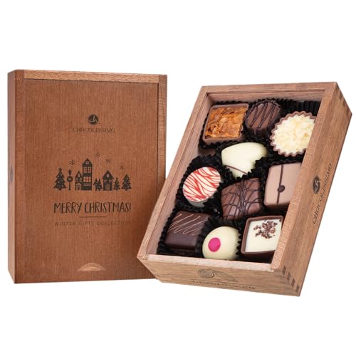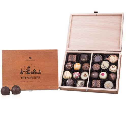 Merry Classic - 20 handgjorda chokladchoklad till jul | Julchoklad i en trälåda | Julklapp | Presentidé | Vuxna | Man | Kvinna | PR-gåva