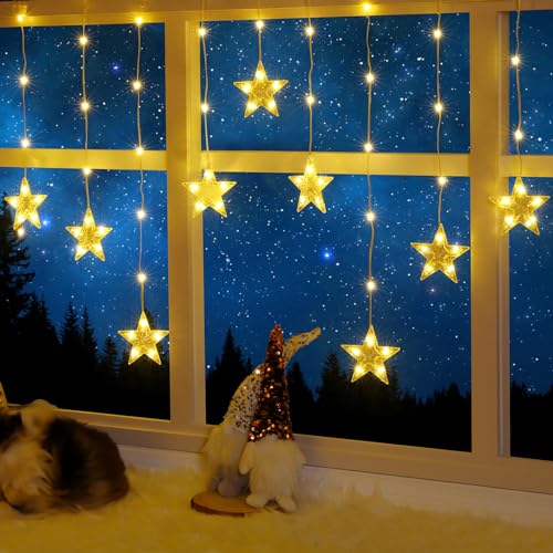 ELKTRY Juldekoration med 9 stjärnor, 76 lysdioder, fönsterdekoration, stjärna, inomhus, batteri, varmvit 8 lägen, ljuskedja, stjärnor, jul, utomhus med timer för fönster, barnrum, jul, balkong,