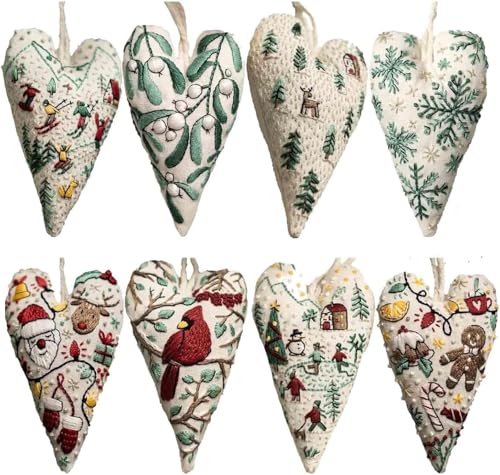 GINGER TECH DIY hjärtbroderi juldekoration, julbroderi kit för nybörjare, gör-det-själv hjärtformad handbroderad julprydnad kit med nålar och tråd (8 st A+B)