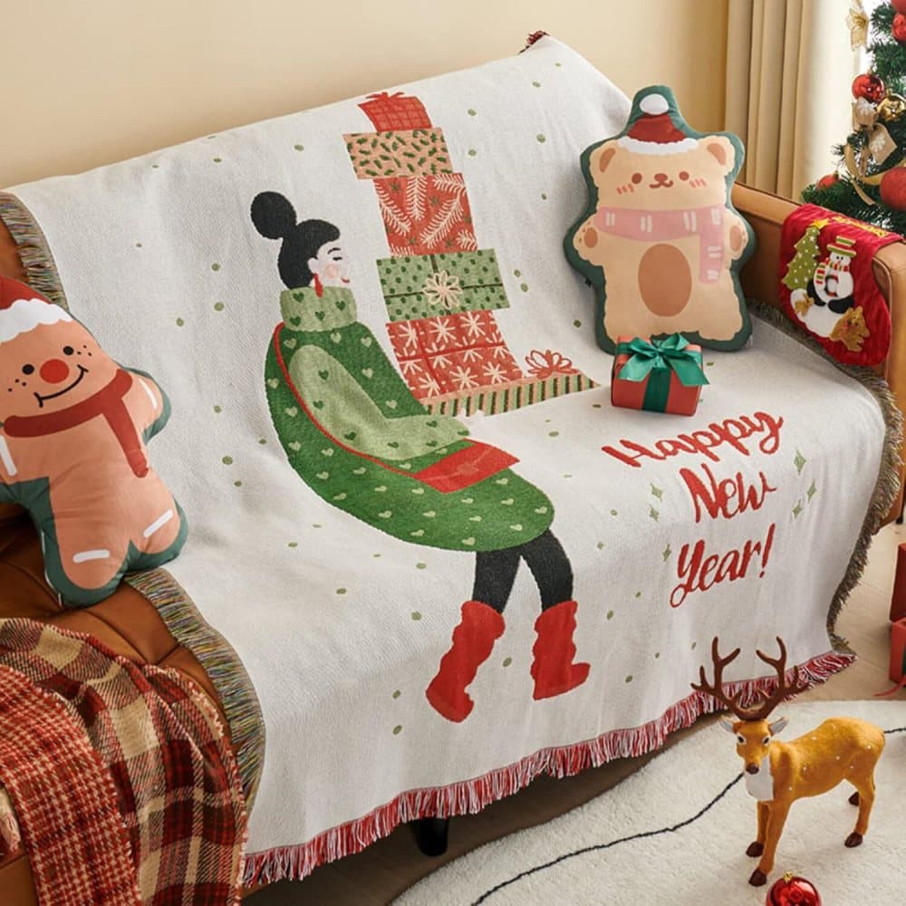 Julfilt i jacquardbomull med tofsar 160x130 cm överkast för soffa, campingduk
