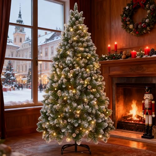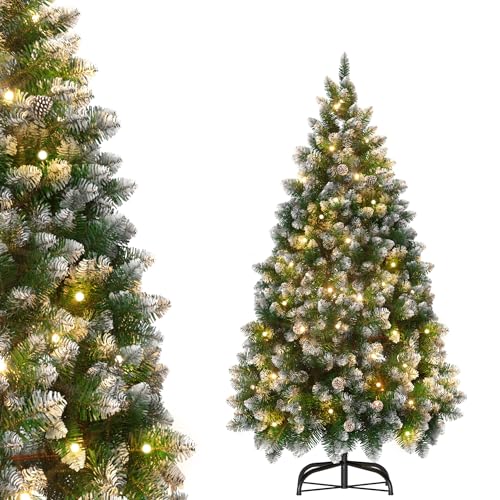 Aufun Konstgjord julgran, med varmvit LED-belysning, inkl. metallstativ, PVC-julgran, återanvändbar juldekoration (snöeffekt + tallkottar + LED, 210 cm)
