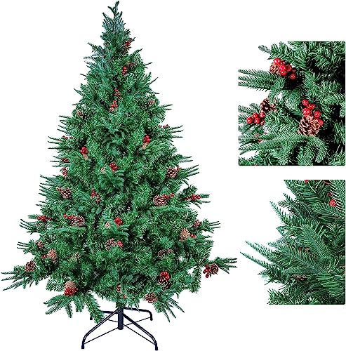 Himaly 1,5 M Konstgjord Julgran Med Tallkottar Och Bär - PVC Med Metallstativ för Inomhus Utomhus, Grön