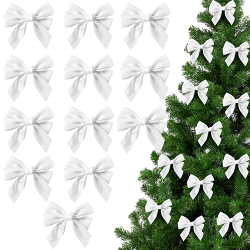 12 st festliga vita rosetter för julgransdekorationer – små 12 cm förknutna vita band julgransrosetter dekorationer för julkrans eller julgirlanger