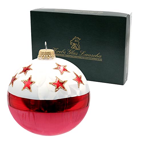 Dekohelden24 Lauschaer julgransdekorationer – uppsättning av 6 glaskulor i isvitt och rött, munblåst och handdekorerat med röda stjärnor, med guldkrona, storlek Ø ca 8 cm