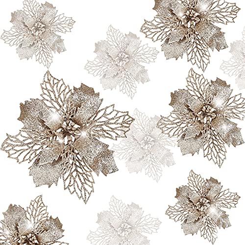 GWHOLE 21 stycken julblommor julgransdekorationer blomma konstgjord blomma glitter julgransprydnad champagne jul