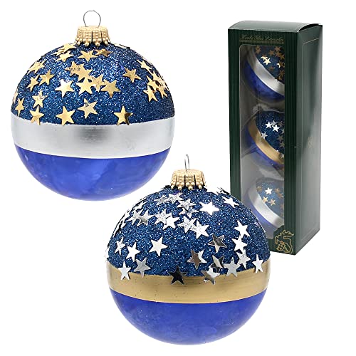 Dekohelden24 Lauschaer Julgransdekorationer – uppsättning av 3 glaskulor i koboltblått, tvåfärgade, munblåsta och handdekorerade med stjärnor, med guldkrona, storlek Ø ca 8 cm