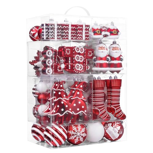 Valery Madelyn julgransprydnadsset, 155 ct röda och vita okrossbara julgransdekorationer bulk, traditionella hängande bollprydnader för julgranar högtid fest dekor