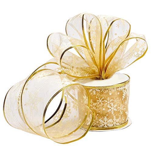 Belle Vous organza-julband i guld– 10 m x 63 mm, brett band med snöflingor och ståltråd, glittrande, julgran, band för julgransdekorationer – organza-band i guldfärg för presentinslagning, hantverk och festdekoration