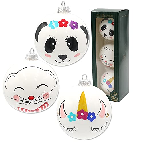 Lauschaer Julgransprydnad – Set om 3 julgranskulor, handmålade och munblåsta med olika djurmotiv, med silverkrona, storlek Ø ca 8 cm