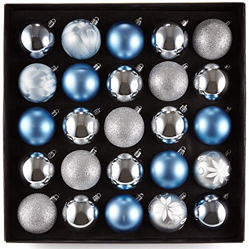 HEITMANN DECO Uppsättning av 25 julgranskulor sortiment – juldekorationer blå silver att hänga upp – plastkulsortiment