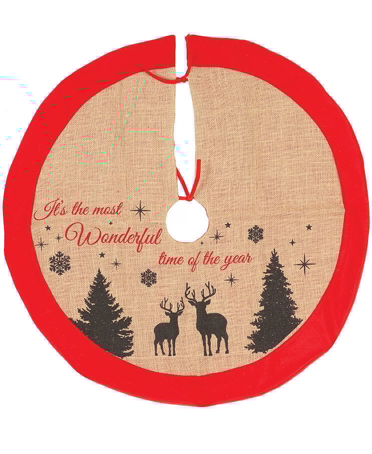 Beige Julgransmatta i Säckväv med Renmotiv och Röd Kant 85 cm