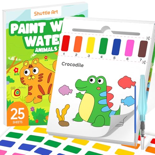 Shuttle konstfärg med vattenfärgsbok för barn, 25 djur-temasidor med 2 borstar, rörfri akvarellfärguppsättning, resevänlig konsthantverk present till småbarn, födelsedagspresent eller julklapp