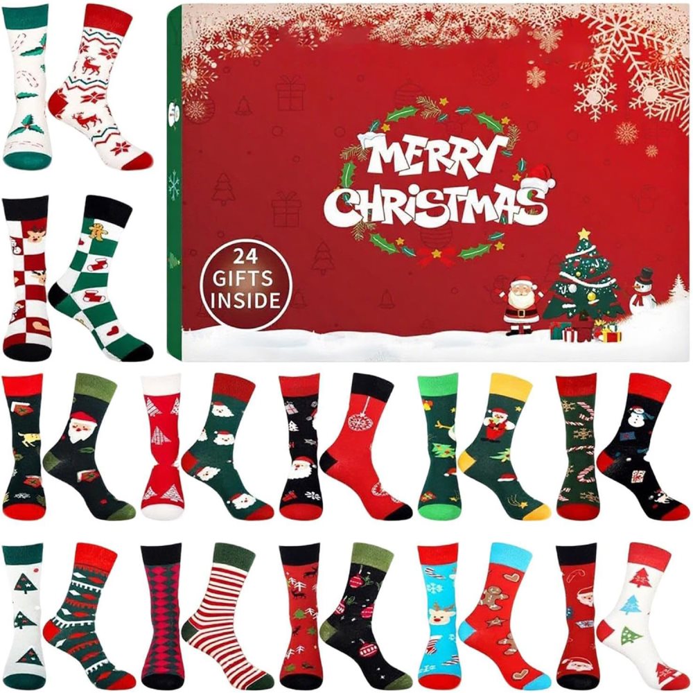 1-pack adventskalender 2025 strumpor: 24-dagars nedräkningskalender (med 24 par julstrumpor), julklappar för vuxna och barn
