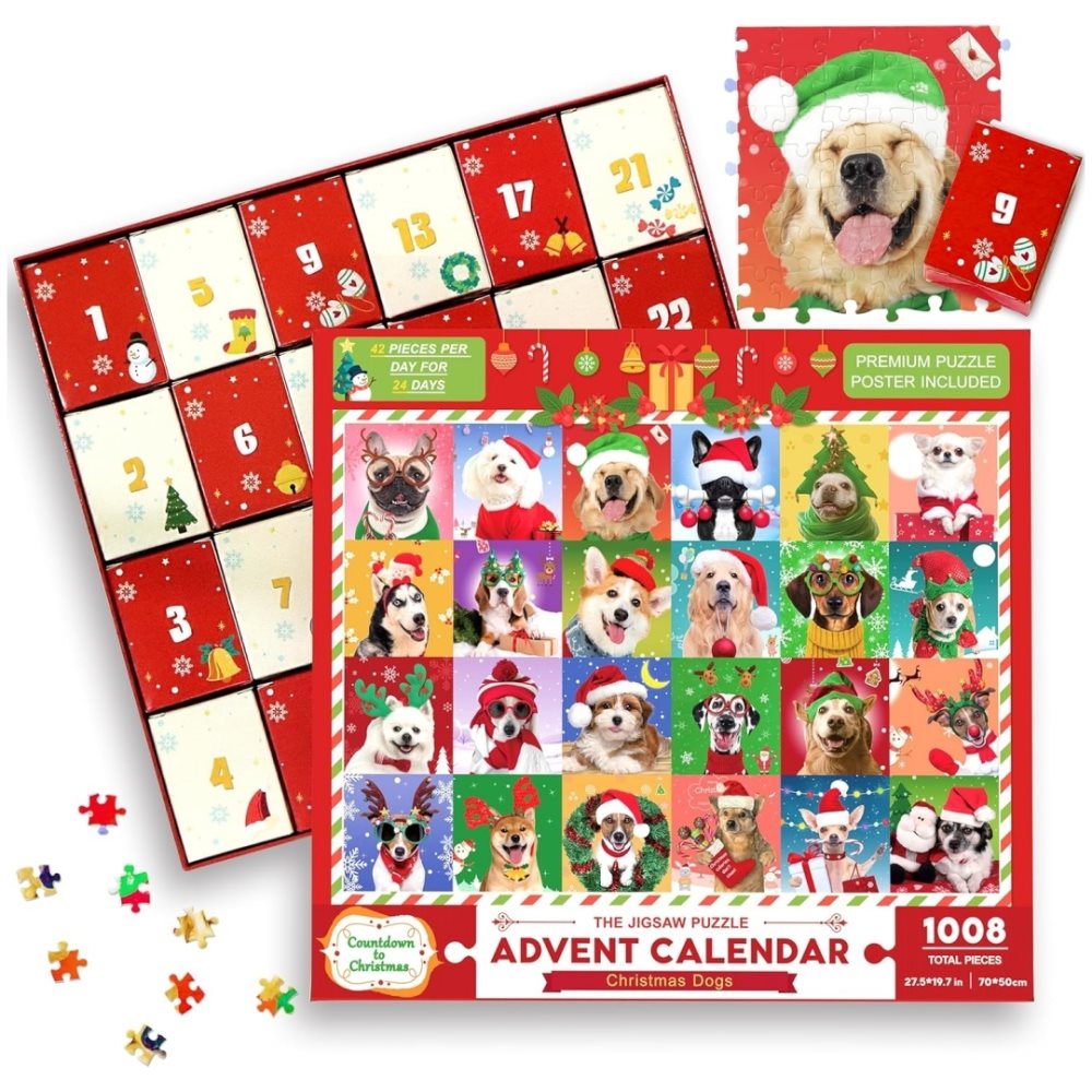Adventskalender 2025 Julpussel - Julhund, 24 lådor med 1008 pussel julkalender, julklappar för vuxna och barn