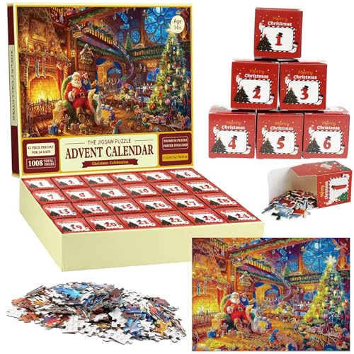 Adventskalender 2024 jultillskott pussel 1008 bitar jul pussel hållbart pussel för vuxna julklappar, presenter till barn pojkar flickor 50 x 70 cm